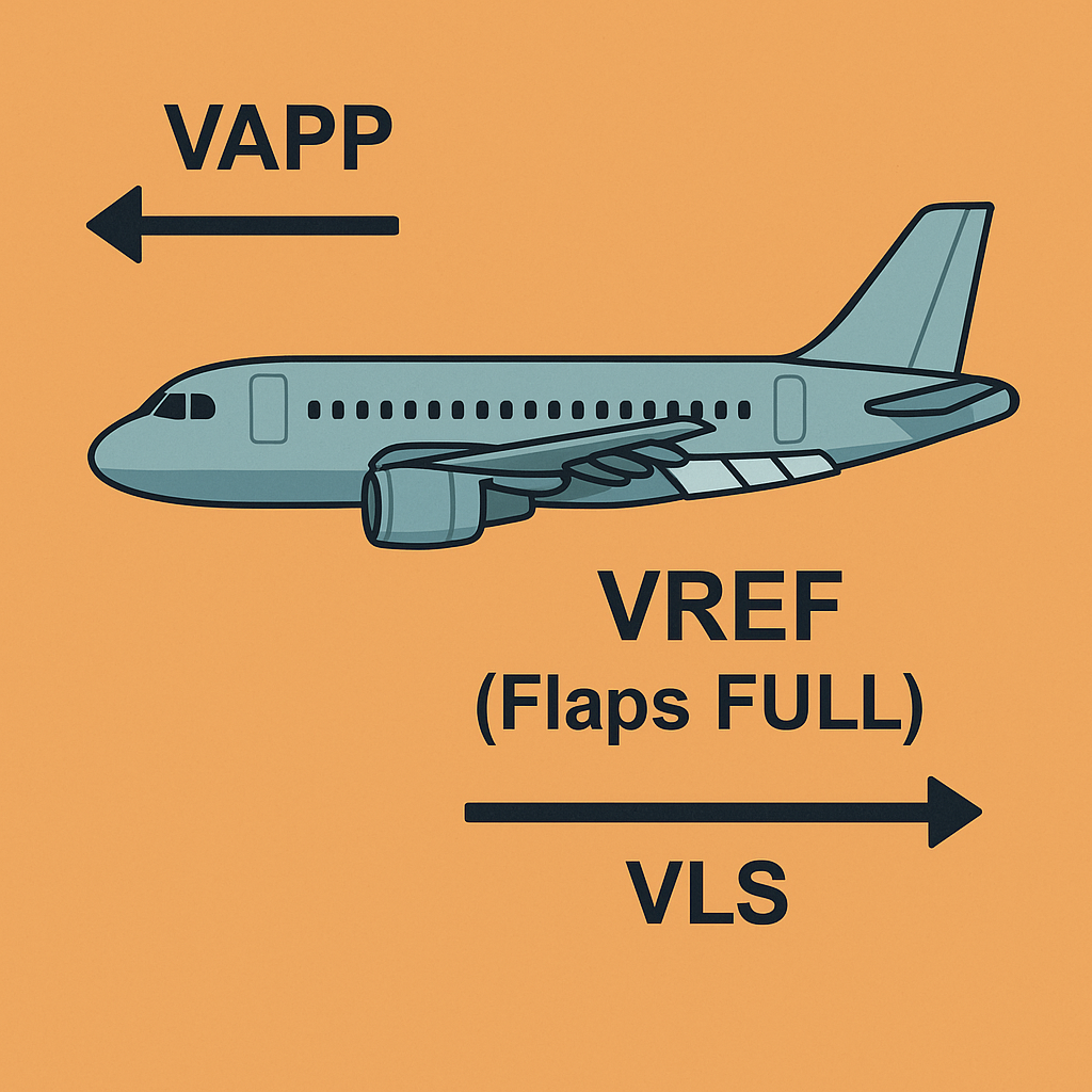 착륙 시 참고 속도. Flaps FULL 착륙 시, 해당 구성에서의 **1g 실속 속도(VS1g)**의 1.23배를 기준으로 산출됩니다. A320 FCOM 기준으로 VREF(FULL) = 1.23 × VS1g(FULL). - VAPP (Approach Speed)